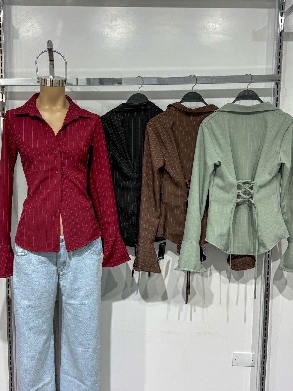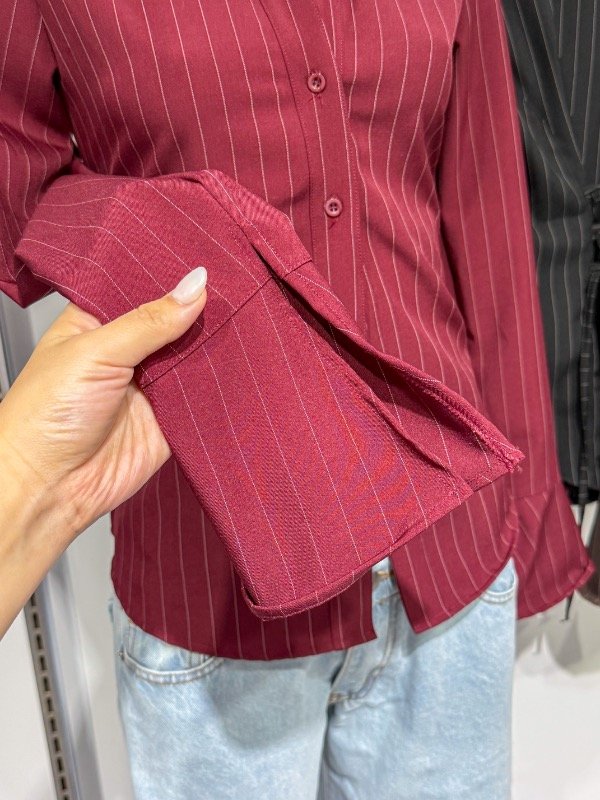 Camisa de tela poplin con botones delanteros, tiras para ajustar y amoldar más al cuerpo y manga Oxford con recorte. Talle único, abarca S/M
