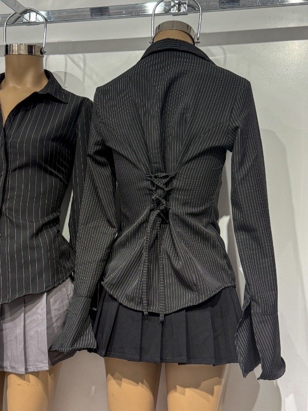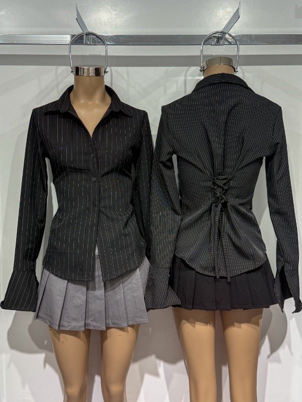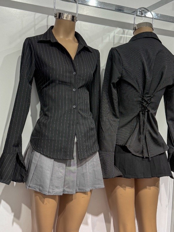 Camisa de tela poplin con botones delanteros, tiras para ajustar y amoldar más al cuerpo y manga Oxford con recorte. Talle único, abarca S/M