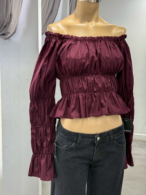 Top paisana cuello bote de tela poplin drapeado con mangas semi Oxford. Talle único, abarca S/M