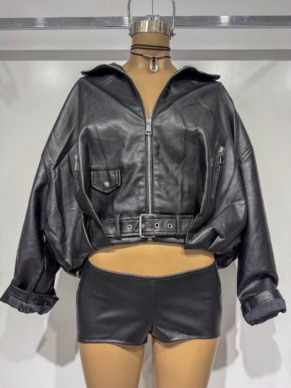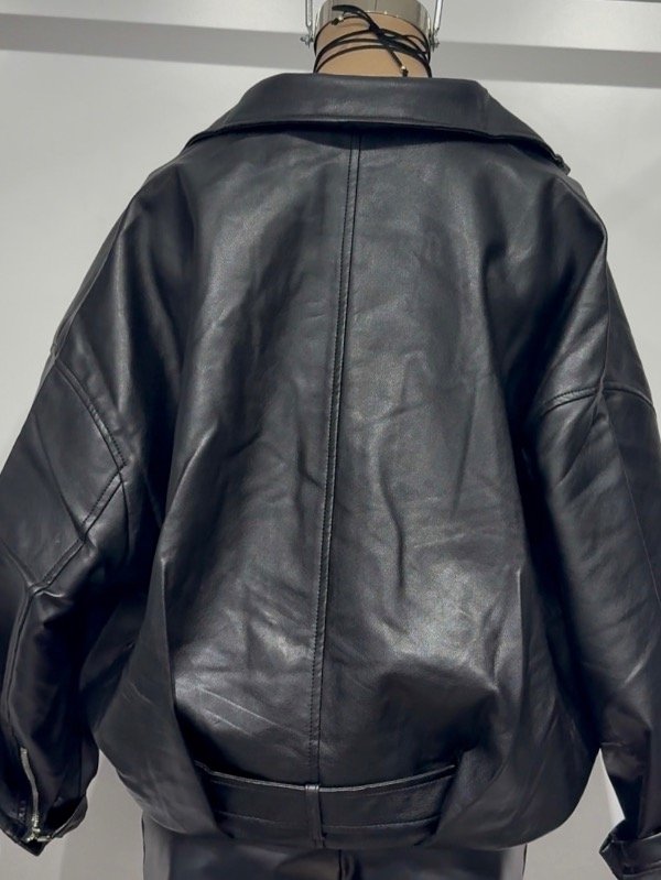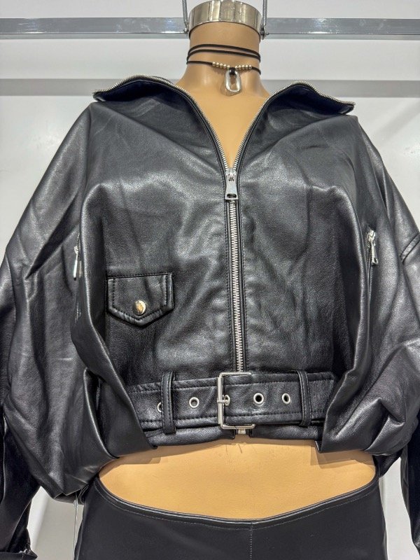 Campera de ecocuero bomber con cierre en las mangas y en los laterales, falso bolsillo con solapa en un costado y cinturón escondido. Abarca un talle M/L. Medidas aprox: SISA 63cm - LARGO 52cm