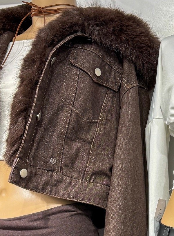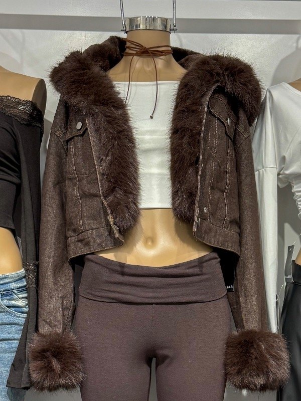 Campera denim chocolate con bolsillos y capucha, forrada en todo su interior con peluche. Además tiene piel desmontable en la capucha y mangas. Talle único, abarca un M.
