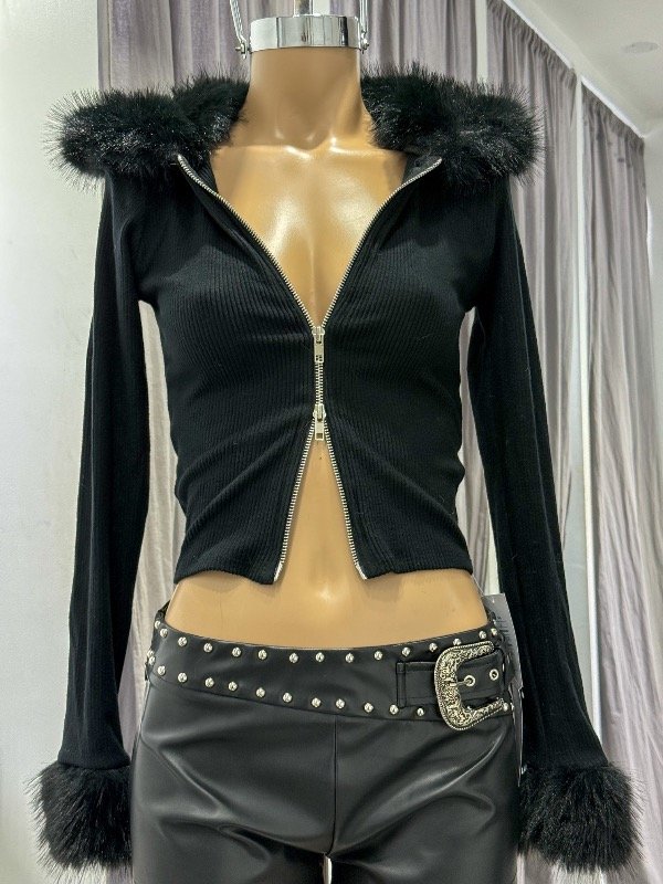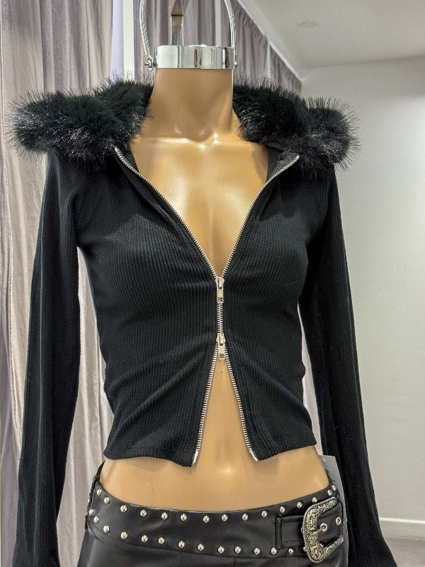 Campera finita de Morley doble cierre con piel en cuello y mangas. Ideal para usar como campera o top. Talle único, abarca S/M