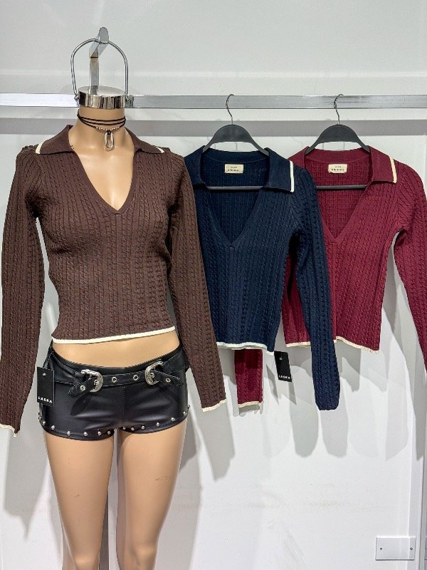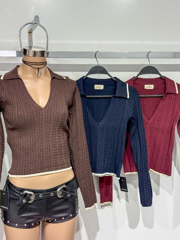 Sweater chomba de hilo con ochitos rayado cuello en V. Talle único, abarca S/M