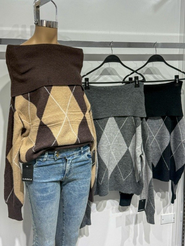 Sweater rombo Over cuello bote. Talle único, abarca hasta un L