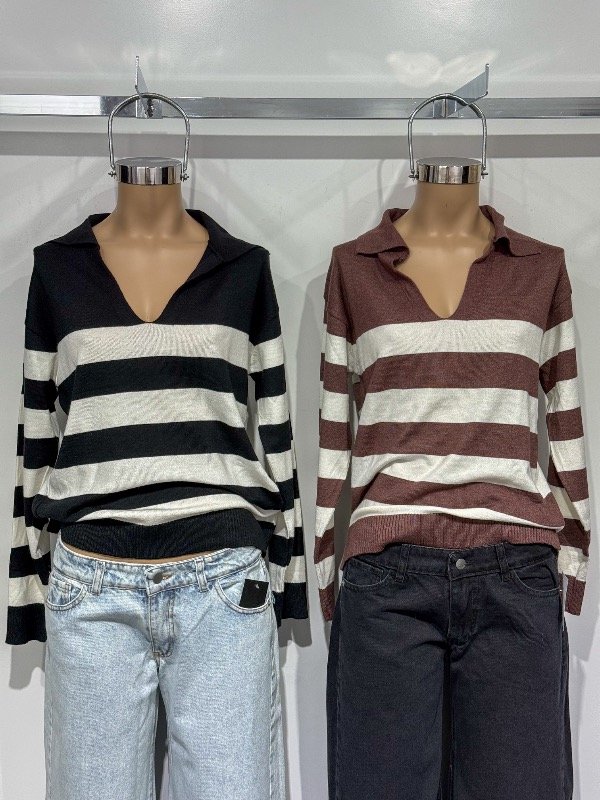 Sweater de hilo rayado liviano tipo chomba cuelo en V. Talle único, abarca S/M