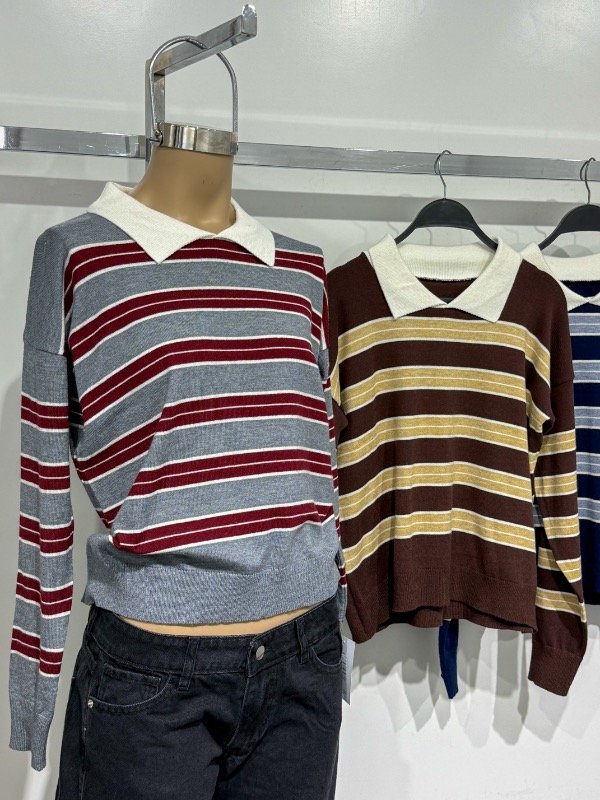 Sweater de hilo fino cuello chomba rayado bicolor. Talle único, abarca S/M