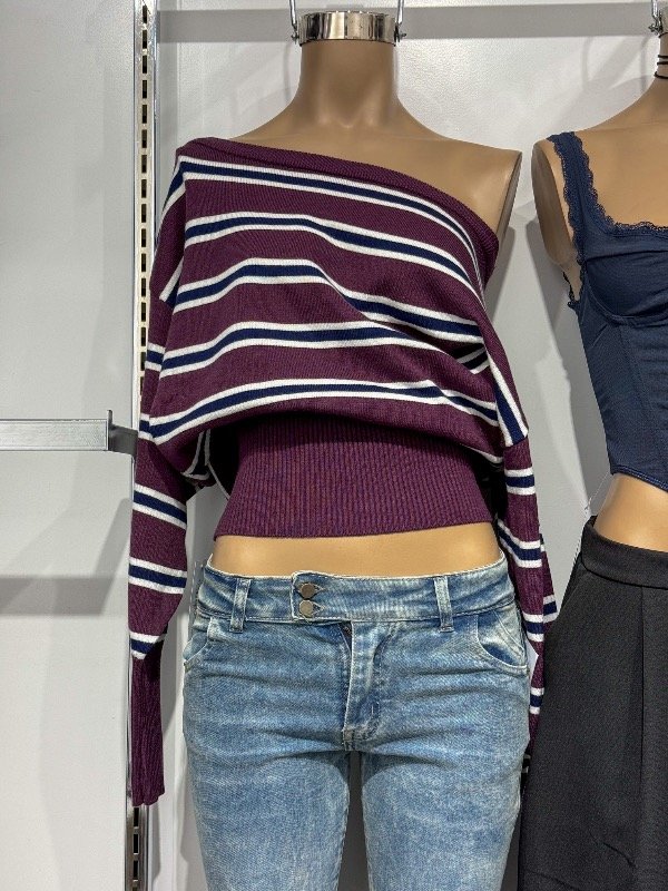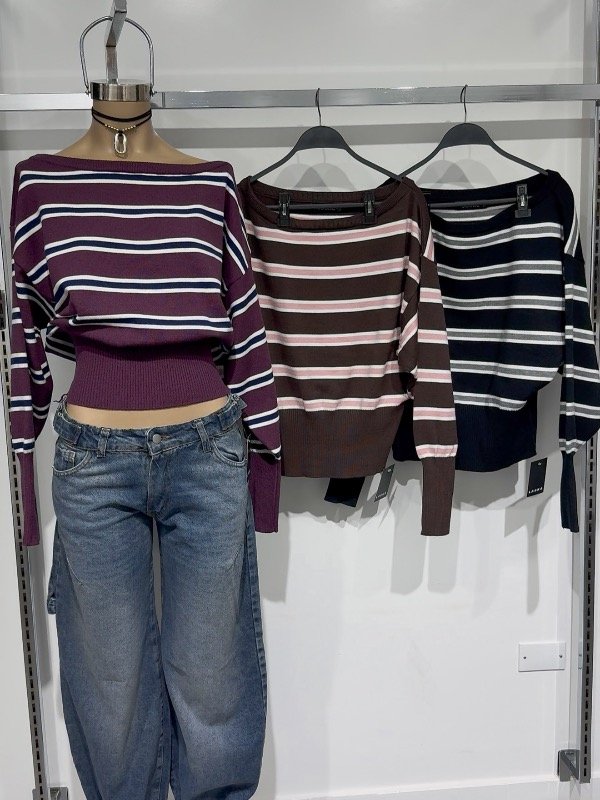 Sweater de hilo tejido calidad premiun rayado con cuello abierto. Viene por talles. Medidas Aproximadas.
