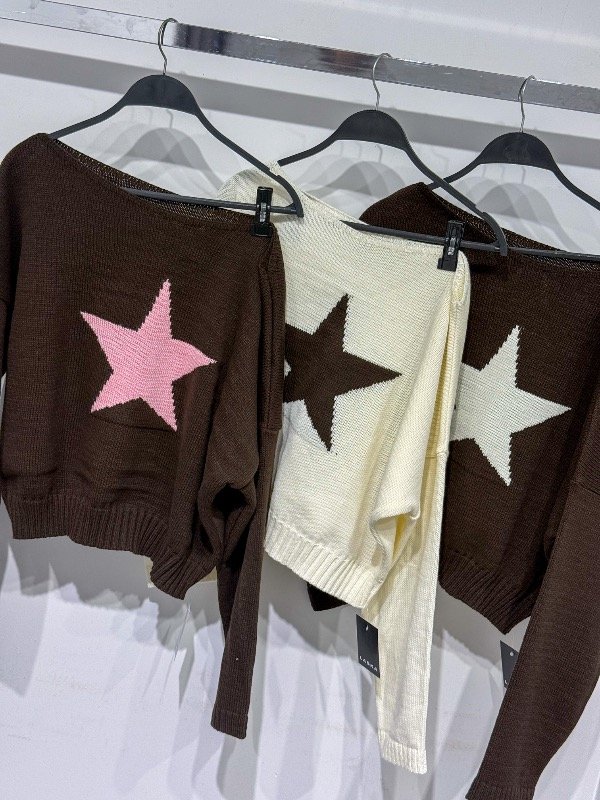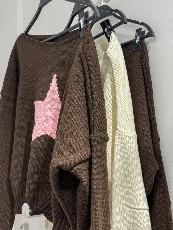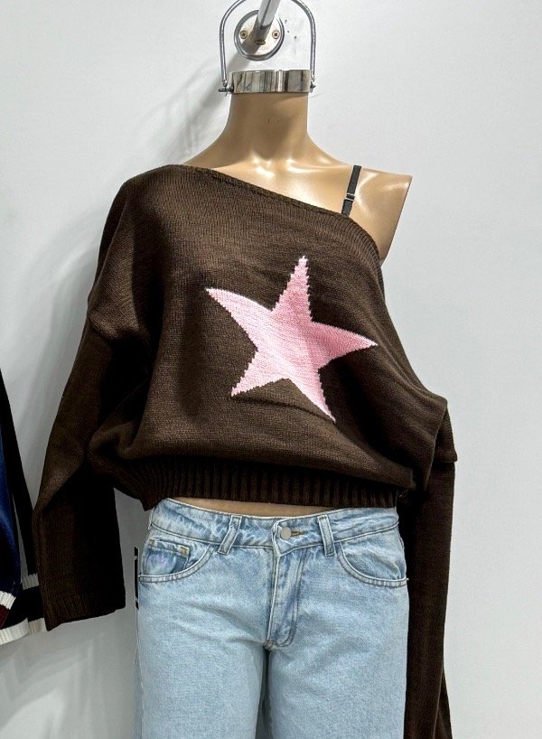 Sweater de hilo grueso con estampa y un hombro caído. Talle único, abarca hasta un L.