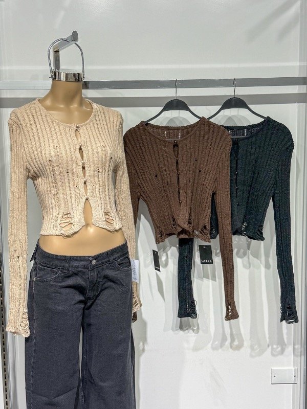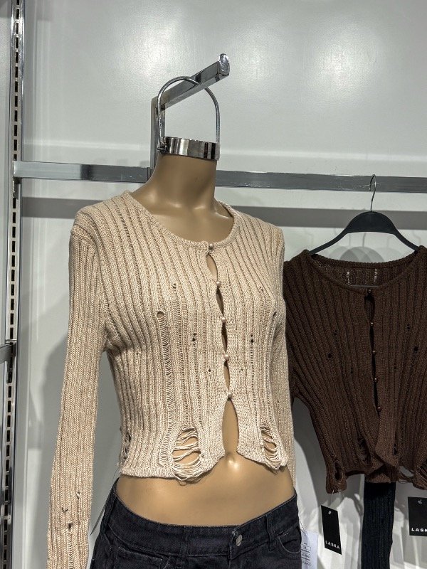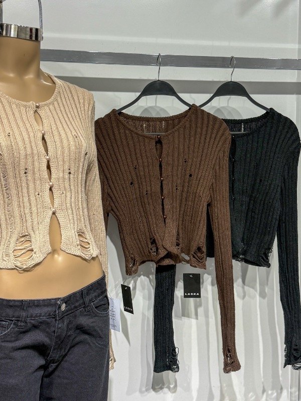 Sweater de hilo calado con sutiles roturas y botones delanteros. Talle único, abarca S/M