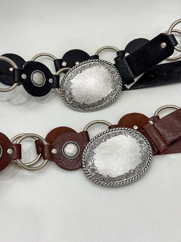 Cinto de eco cuero con arandelas y hebilla trabajada. Talle único (abarca de 36 al 40)