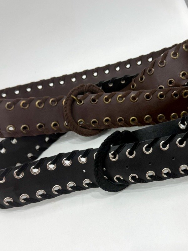 Cinturón de cuerina con ojales y tiras de gamuza cruzadas. Talle único, abarca hasta un 42.