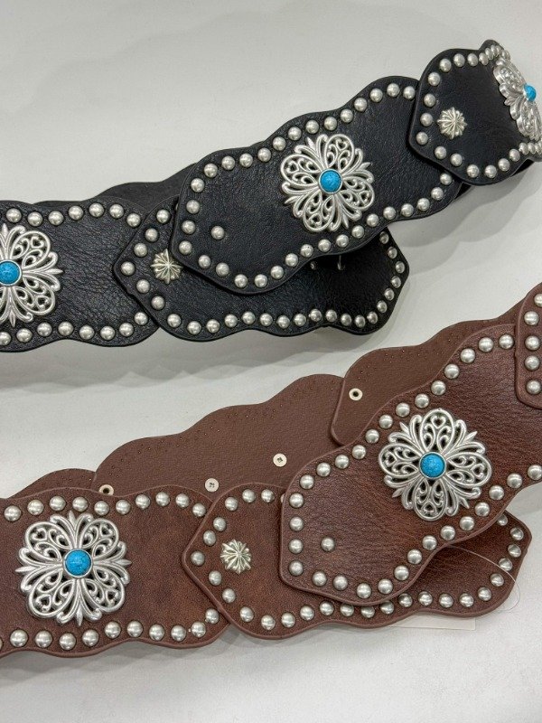 Faja de cuerina con tachas y hebilla en forma de flor y perlas turquesas. Talle único, abarca del 36 al 40.