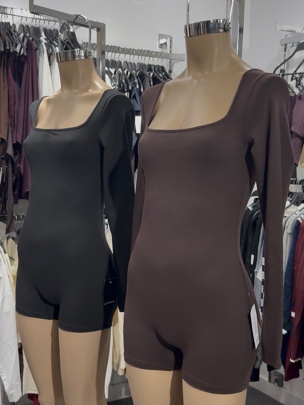 Catsuit de algodón elastizado cuello cuadrado con manga larga. Talle único, abarca S/M