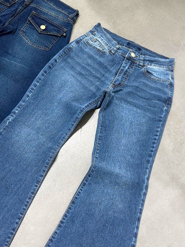 Denim Oxford elastizado, tiro bajo con bolsillos con solapa traseros. Clásico en la parte de adelante.