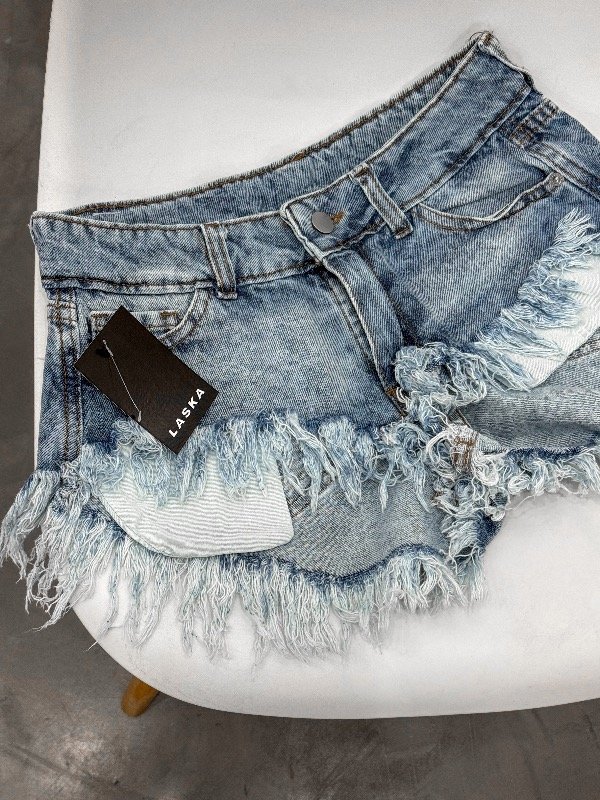 Short denim color celeste tiro bajo desflecado con los bolsillos delanteros sobre salidos. Disponible por talles. Medidas aprox: