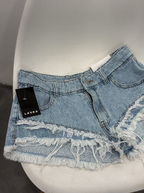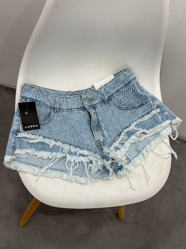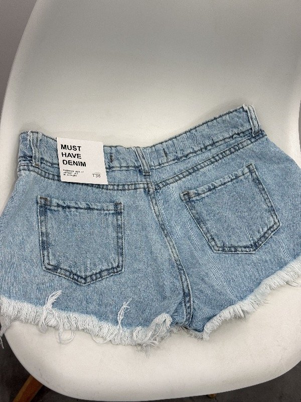 Short celeste tiro bajo con doble rotura delantera, bolillos adelante y atrás. Disponible por talle. Medidas aprox: