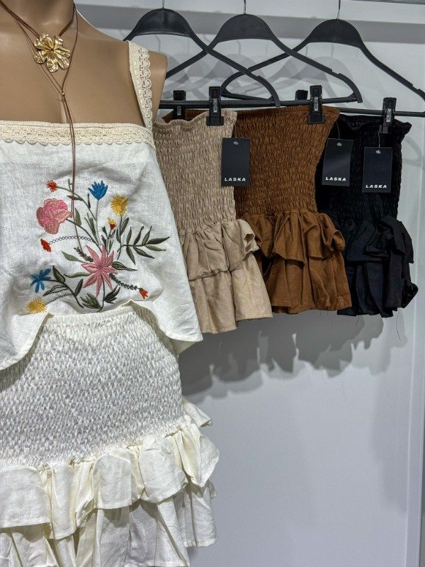 Mini de lino tiro medio. Drapeada con volados. Talle único, abarca 36/38