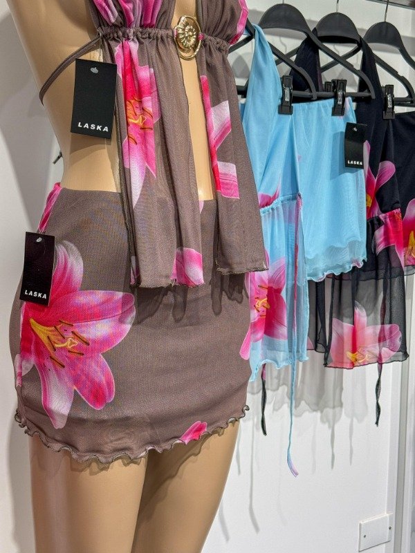 Mini de micro tull sublimado forrado con rulotex. Talle único, abarca 36/38.