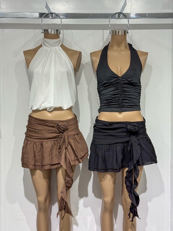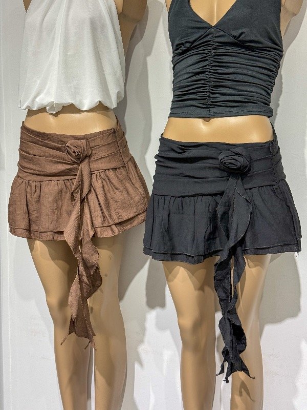 Mini de volados con rosa lateral y volado colgando. Cierre lateral. Talle único, abarca 36/38