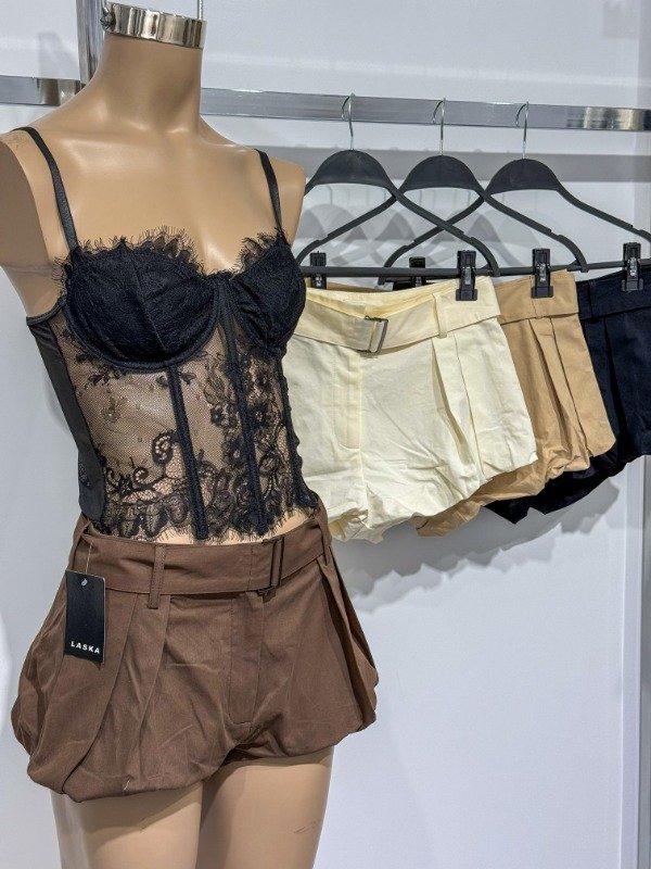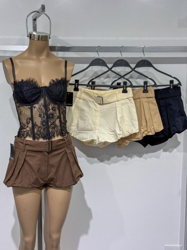 Short sastrero con tablas, cinturón y falsos bolsillos traseros. Disponible en talle S y M. Medidas aprox: