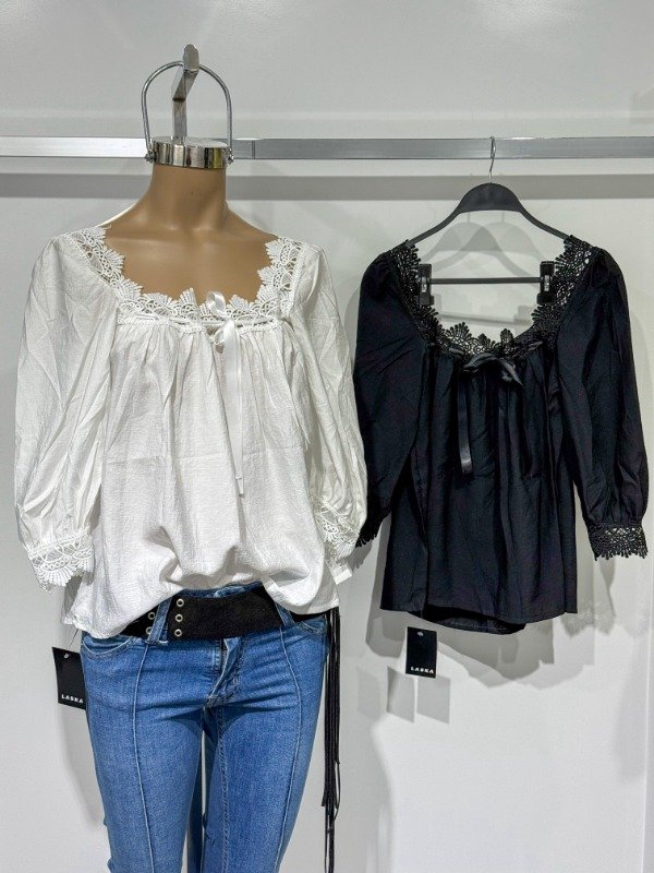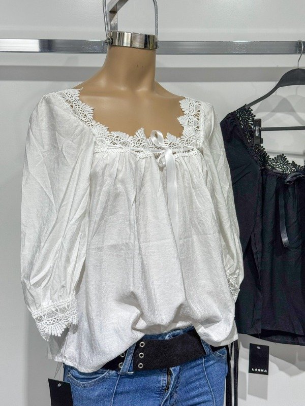 Blusa suelta con lazo, manga 3/4, cuello bote con blonda. Talle único, abarca hasta un L.