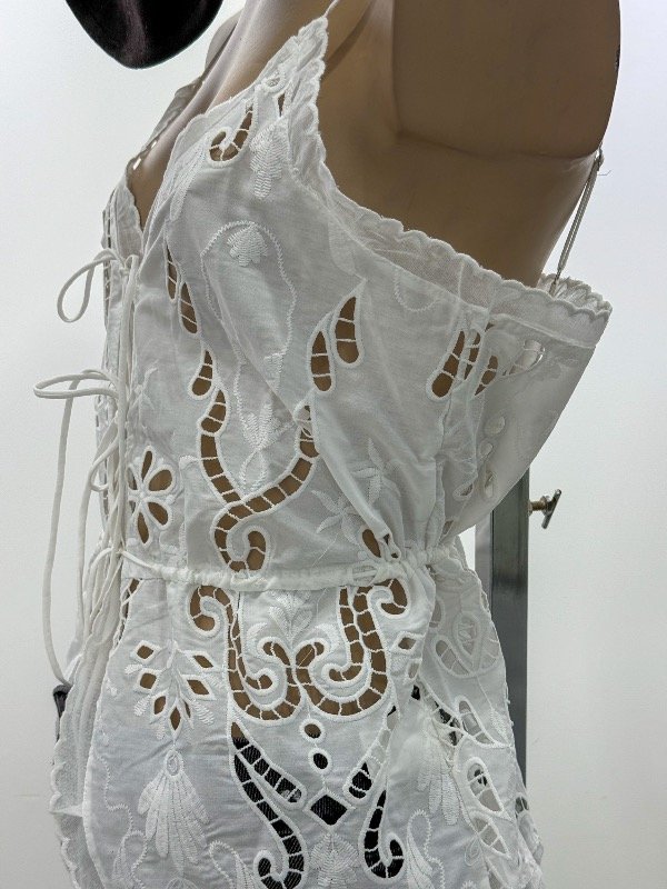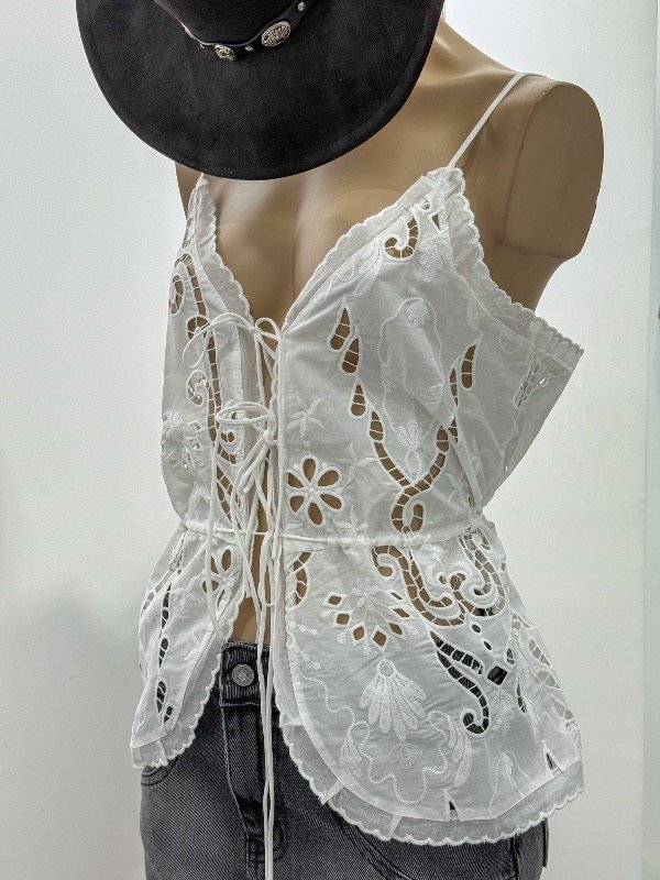 Blusa de lino bordado con recortes. Talle único, abarca s/m.