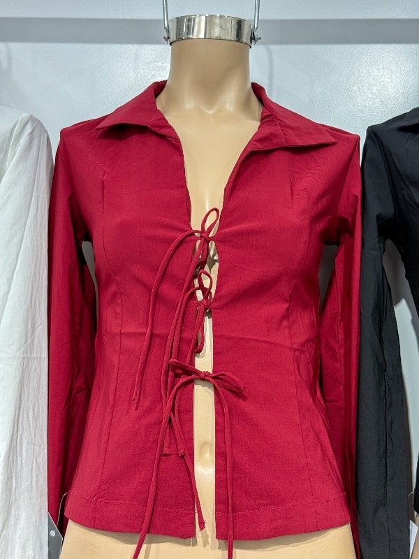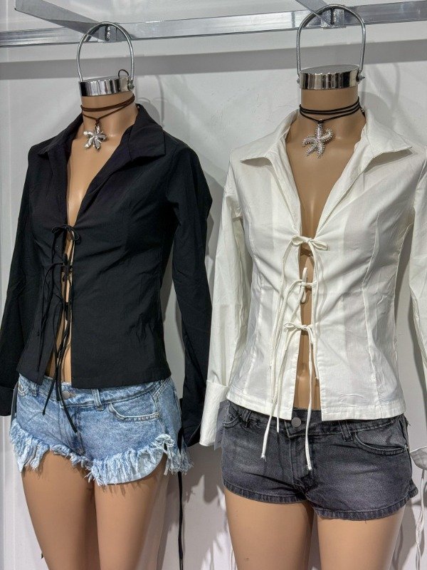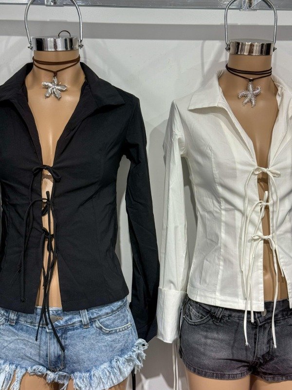 Camisa de tela elastizada manga larga, con cordones para anudar en la parte media y puños. Talle único, abarca un talle M.