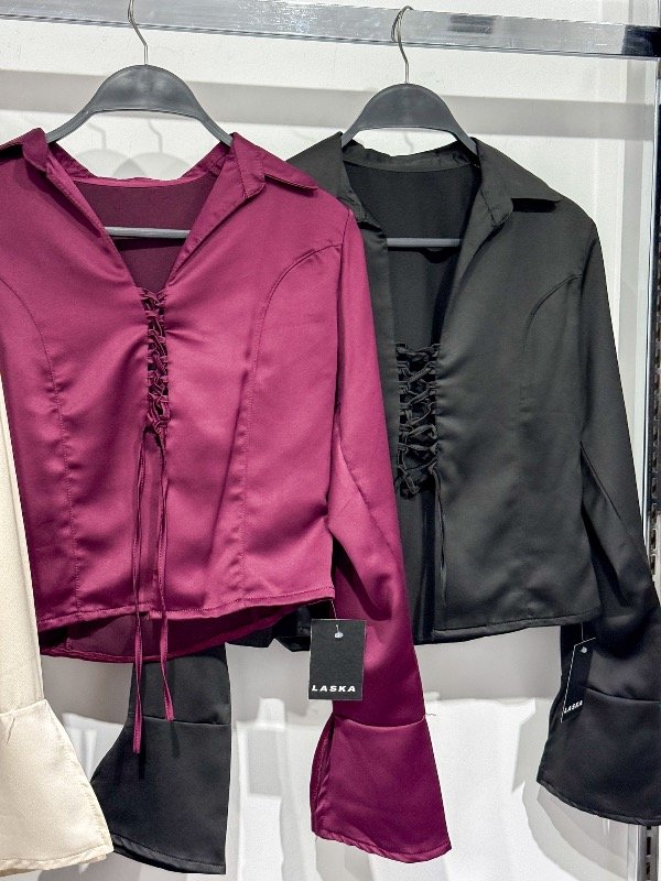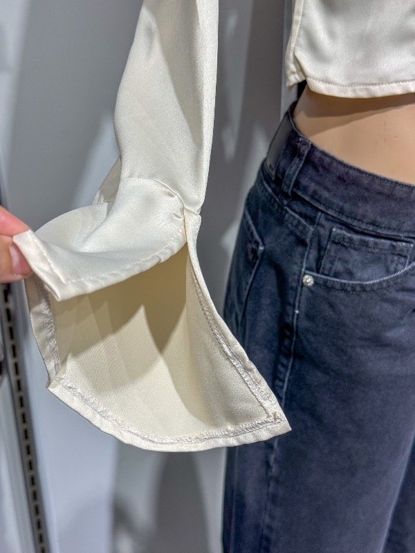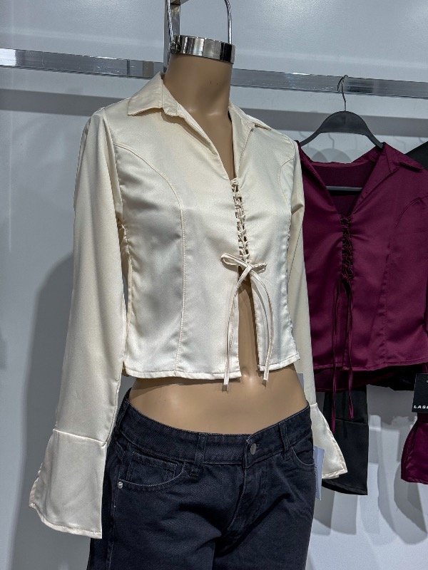 Camisa de gasita al cuerpo con tiras para cruzar en el medio y manga Oxford con tajo. Talle único, abarca S/M