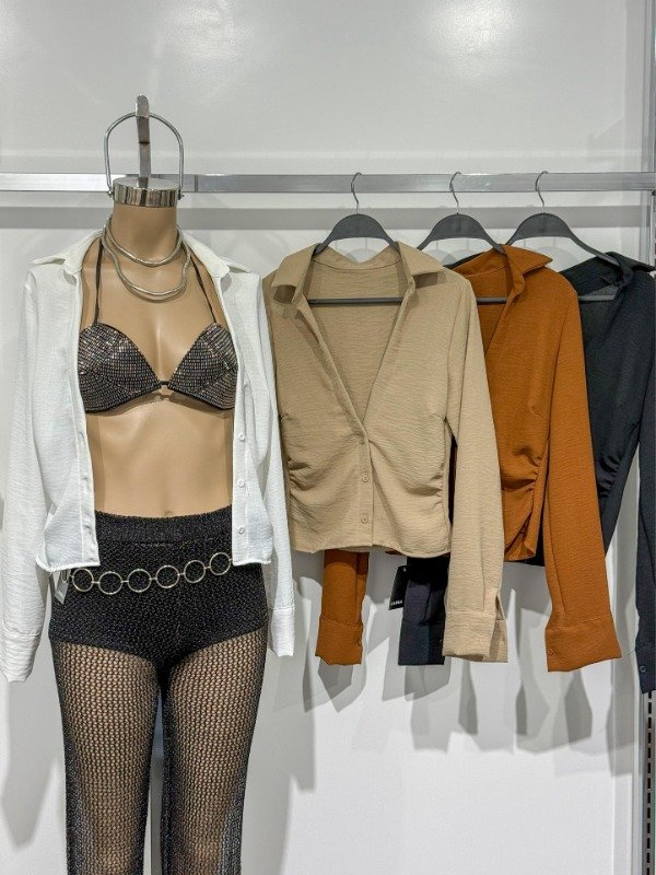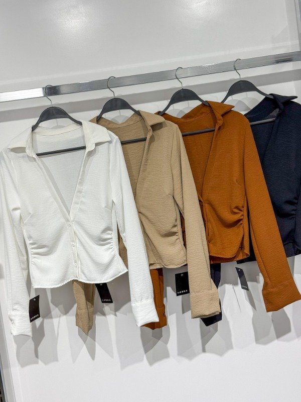 Camisa de Sedita con cuello en V, frunces laterales y botones. Talle único, abarca un S/M