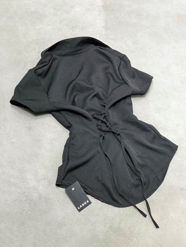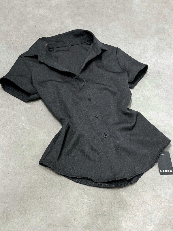 Camisa clásica negra con botones con tira para cruzar y ajustar al cuerpo en la parte trasera. Talle único, abarca un S/M. Medidas aprox: