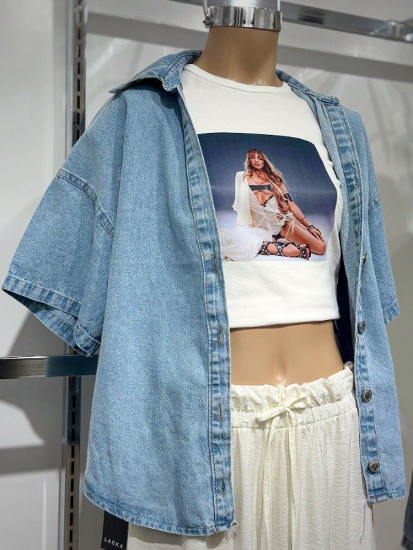 Camisa denim color celeste claro Over. Disponible en S/M. Medidas aprox: