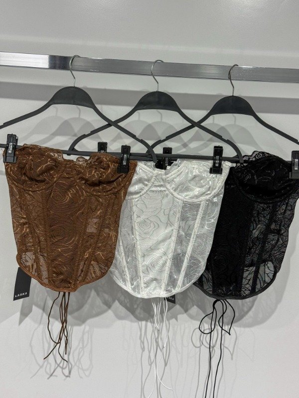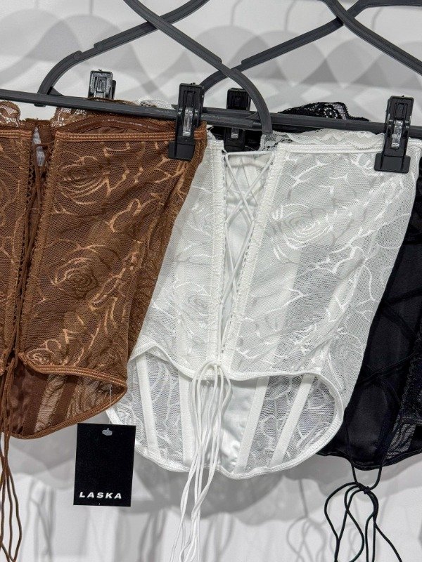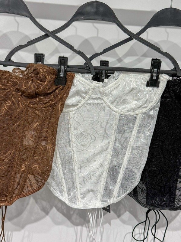 Corset de microtull con rosas, tiene aro, ballenas y tira colita de ratón para regular el ancho en la espalda. Talle único, abarca S/M