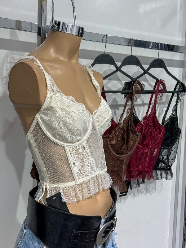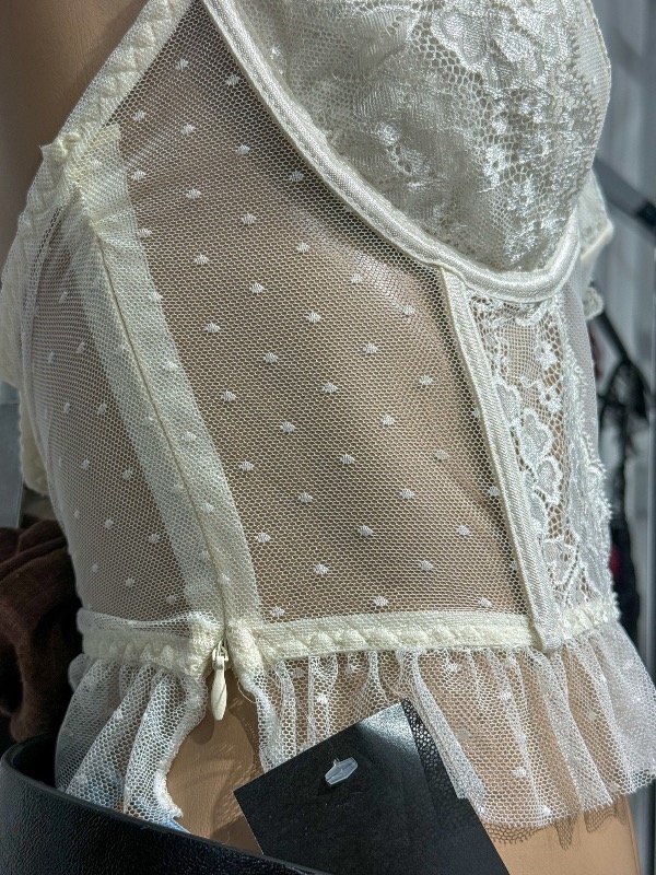 Corset de encaje con puntitos, tazas, volados y cierre lateral. Talle único, abarca un M.