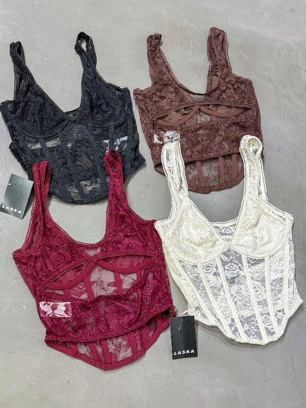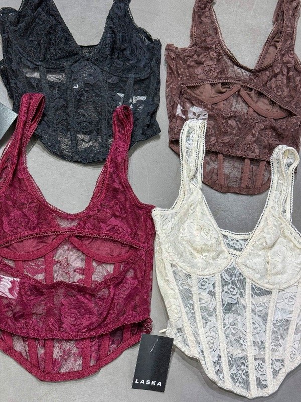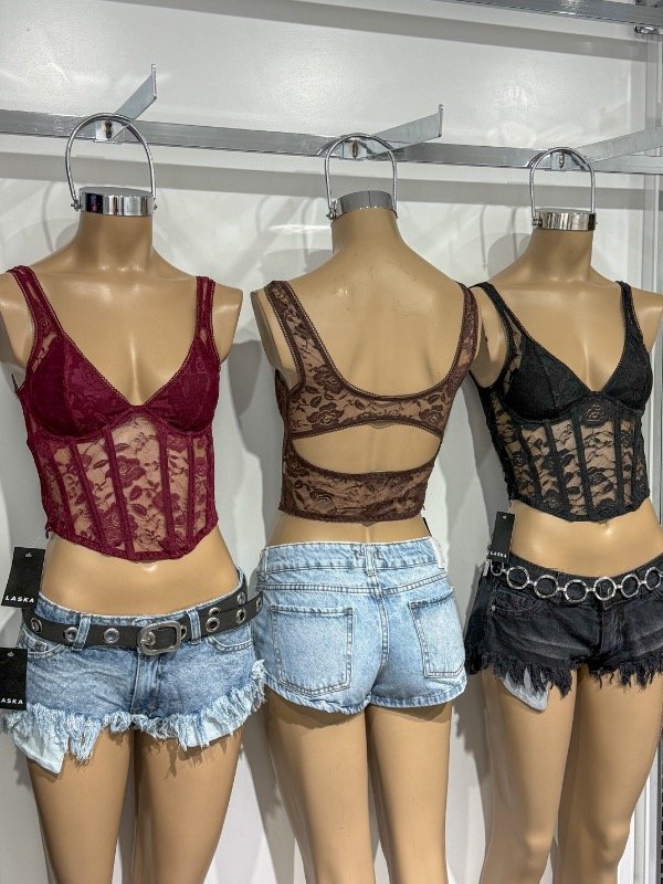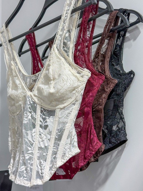 Corset de encaje con aro, ballenas, escote en espalda y cierre lateral. Talle único, abarca un M.