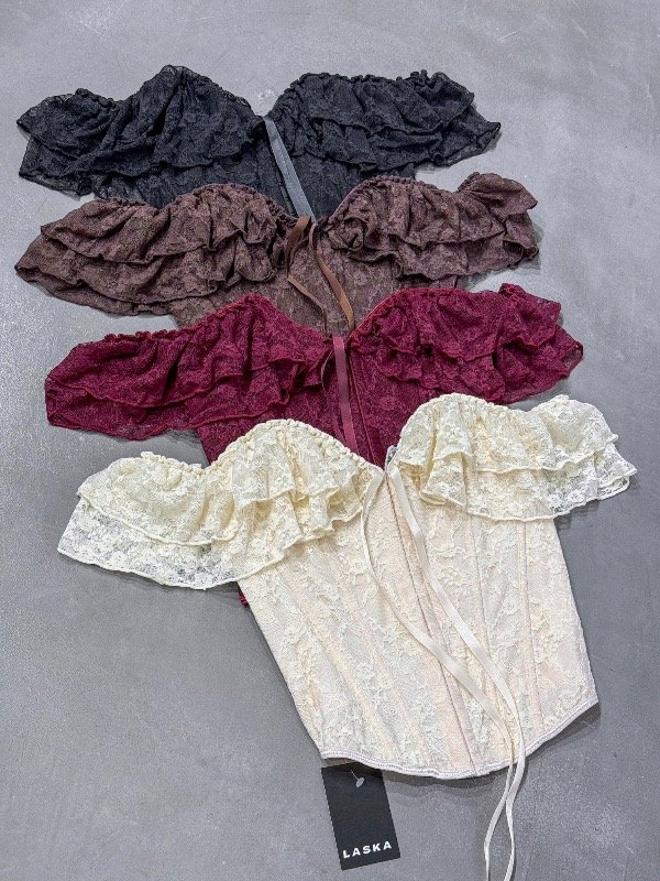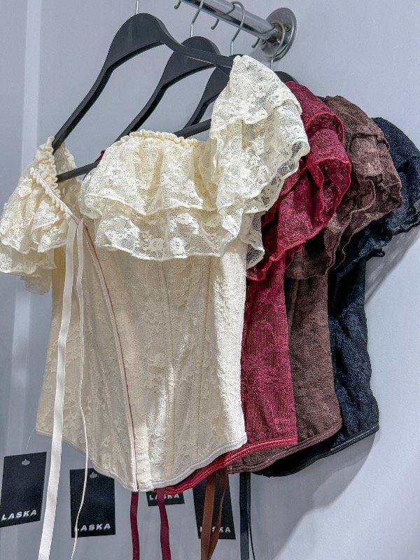 Corset de encaje con voladitos cuello bote y broches delanteros. Talle único, abarca un M.