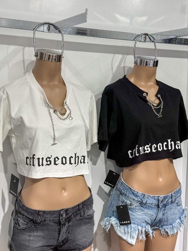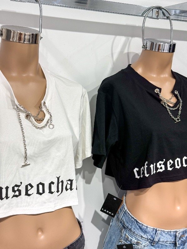 Remera Crop de algodón con estampa y cadena en el medio. Talle único, abarca un hasta un M