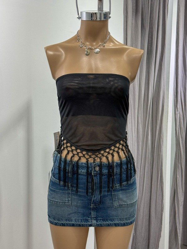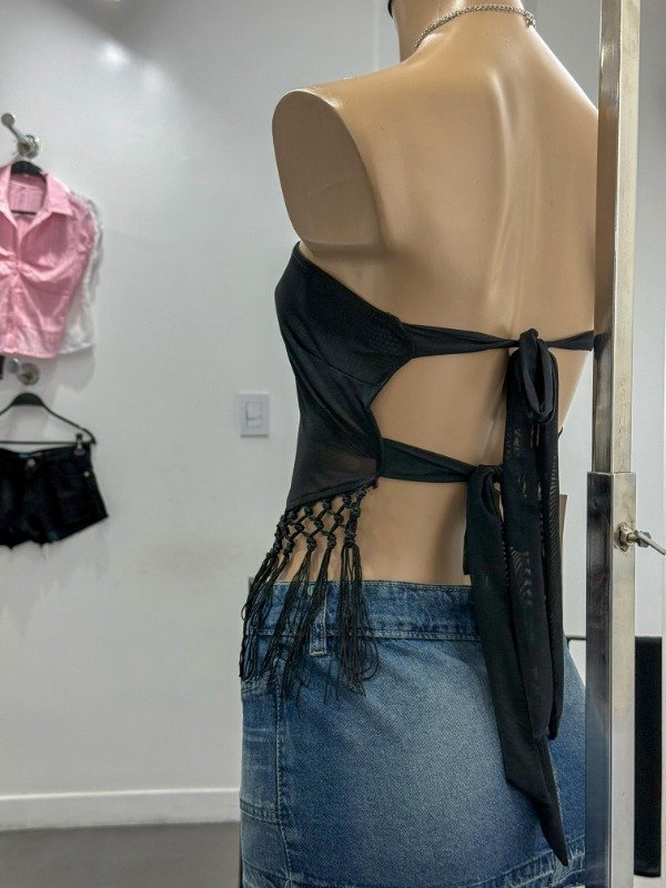 Top de micro tull tipo bandana con flecos cruzados y anudados. Tiras para anudar en espalda. Talle único (abarca S/M)