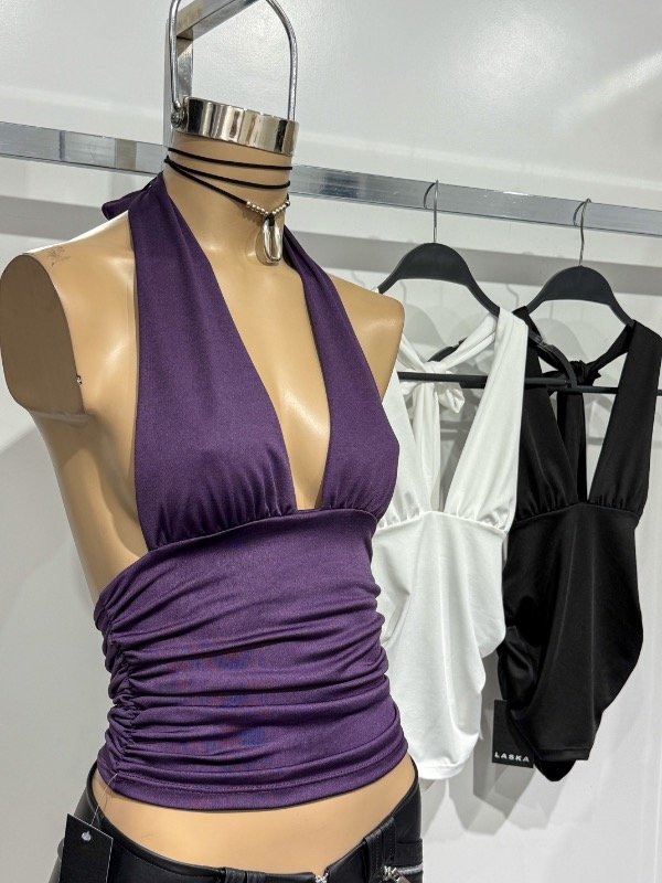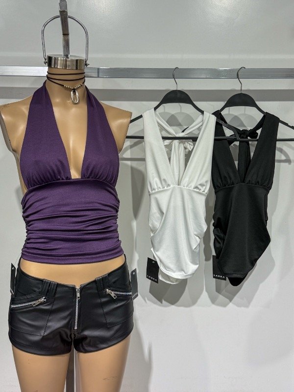 Top de microfibra escote en V en la parte de adelante y atrás, frunces laterales y lazo para anudar en cuello. Talle único, abarca S/M