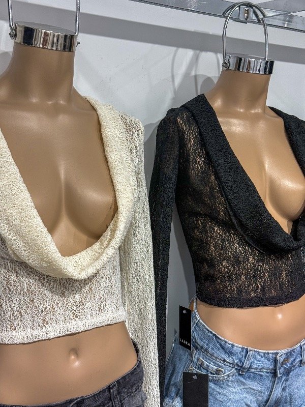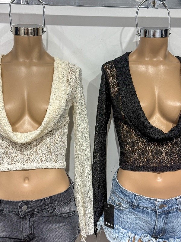 Top de encaje tramado manga Oxford, cuello ultra buche. Talle único, abarca S/M