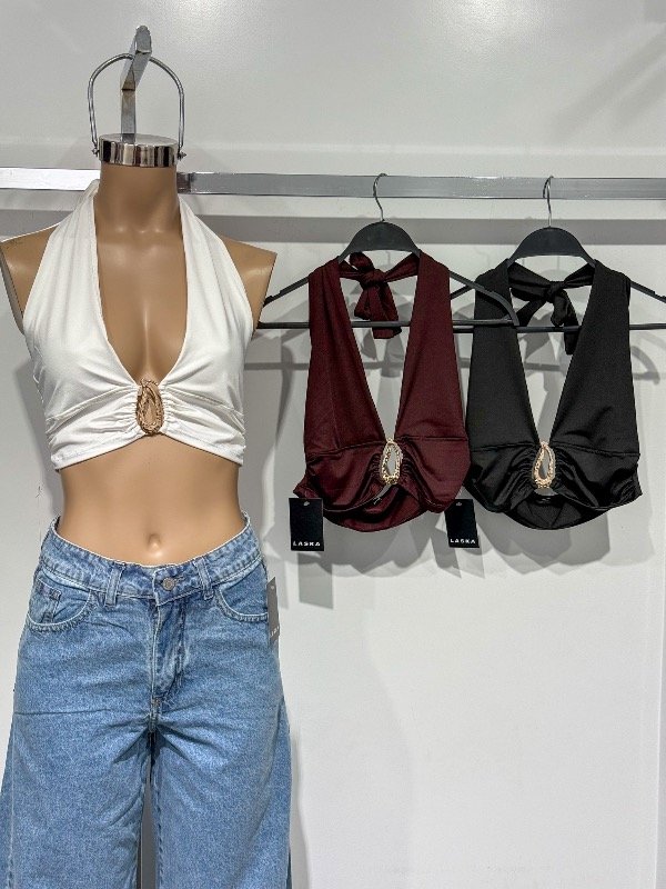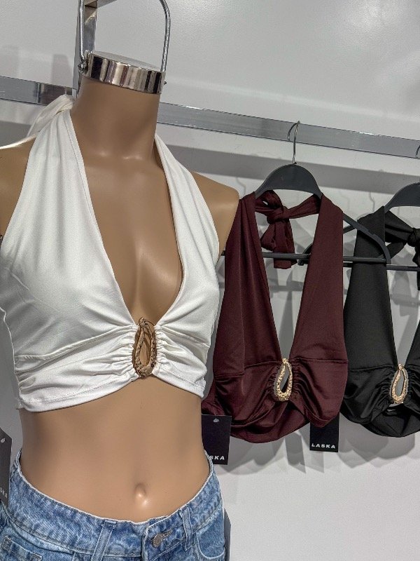 Top de microfibra con lazo para anudar en el cuello y hebilla dorado en el medio. Talle único, abarca S/M