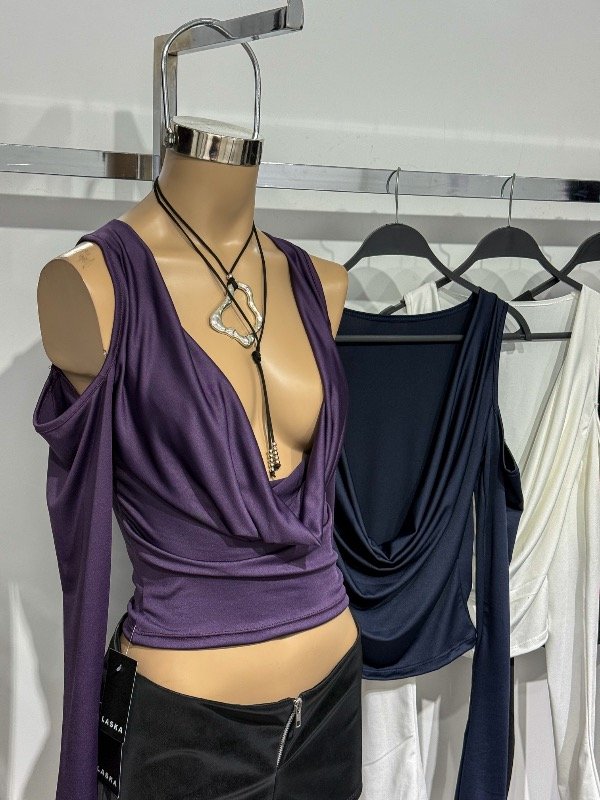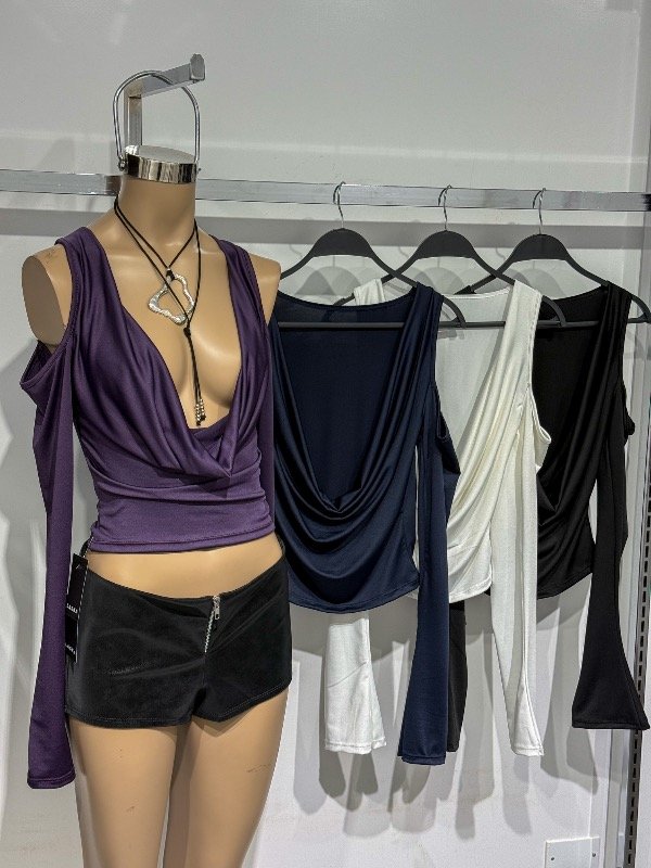 Top de microfibra manga larga con escote en hombros y cuello buche. Talle único, abarca S/M