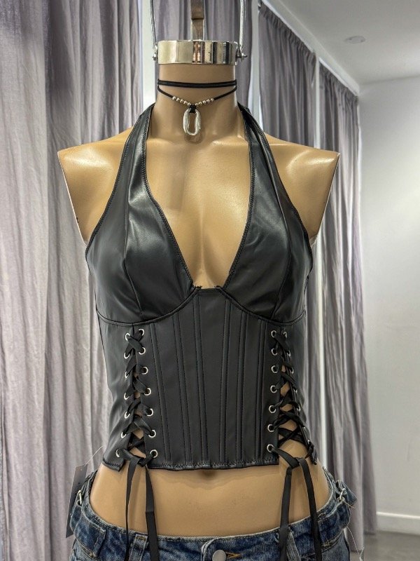 Top corsetero engomado con cuello en V, ballenas y cintas para cruzar y ajustar en ambos laterales. Talle único, abarca un M.