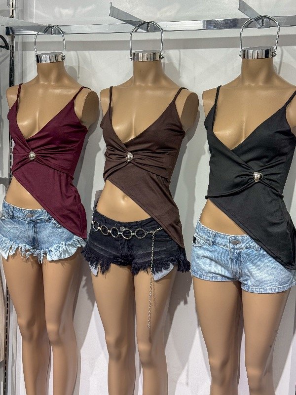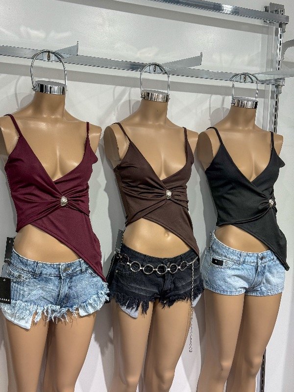 Top de microfibra cruzado con caída en pico lateral y hebilla circular. Talle único, abarca S/M