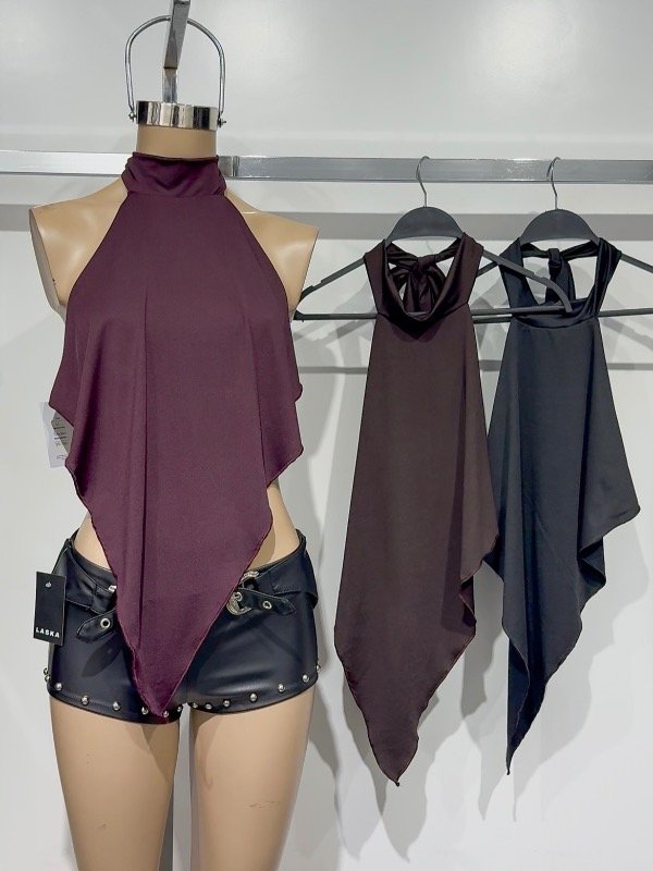 Top de microfibra tipo pechera con cuello cerrado y espalda totalmente descubierta. Talle único, abarca S/M