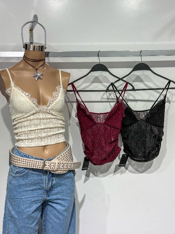 Top de red tramado con puntilla en el busto y frunces. Talle unico, abarca S/M