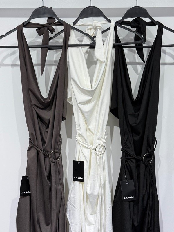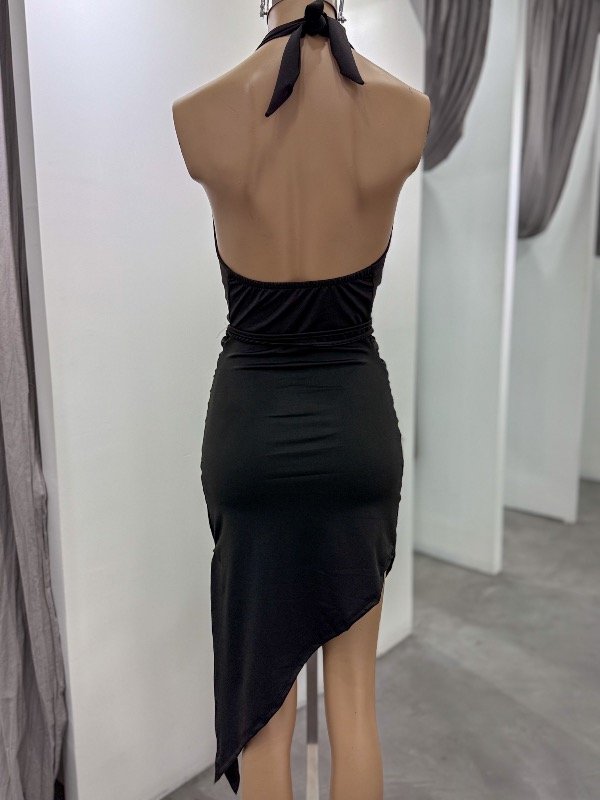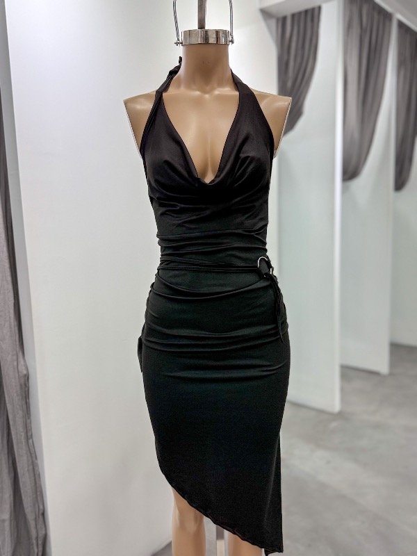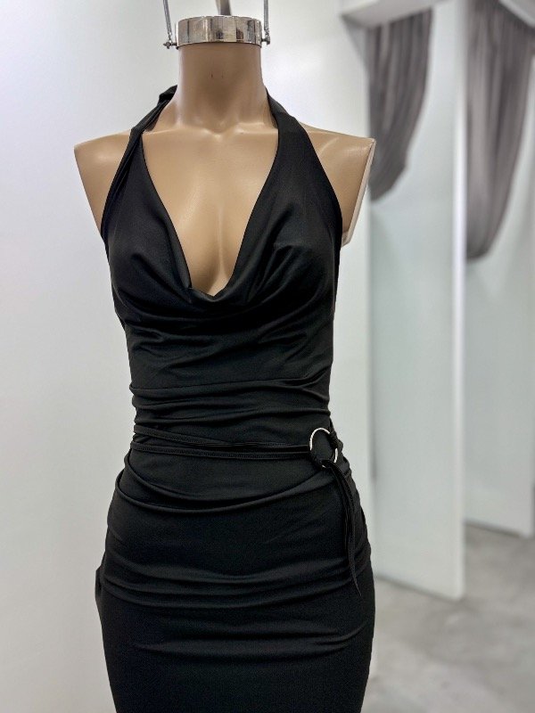 Vestido de microfibra largo con caída en pico, tiene cuello buche, espalda semidescubierta y tira con arandela para girar en la cintura. Talle único, abarca S/M
