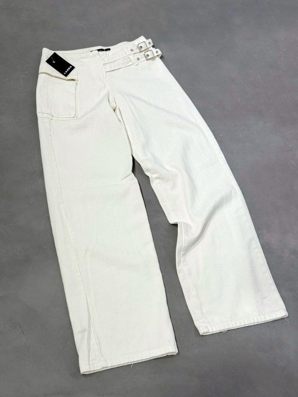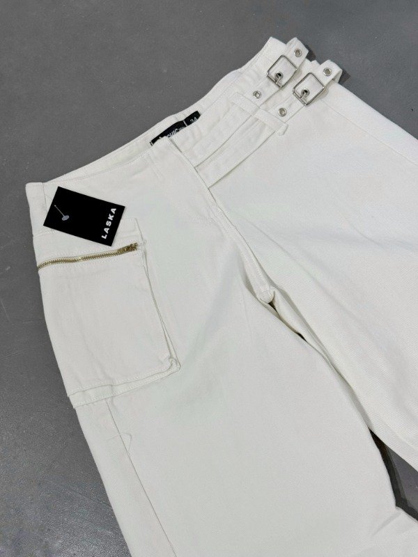Denim tiro bajo color natural, con cinturones en un lateral y bolsillo en el otro. Medidas aproximadas: