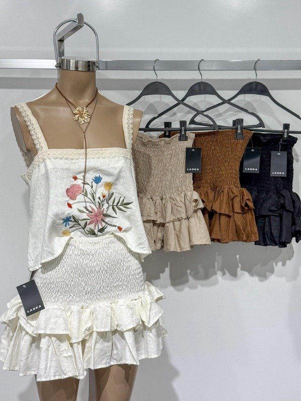 Mini de lino tiro medio. Drapeada con volados. Talle único, abarca 36/38.