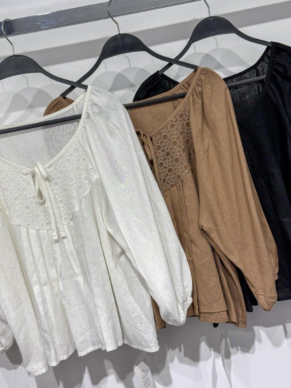 Blusa de lino Over con manga 3/4 y bordado en el frente. Talle único, abarca hasta un L.