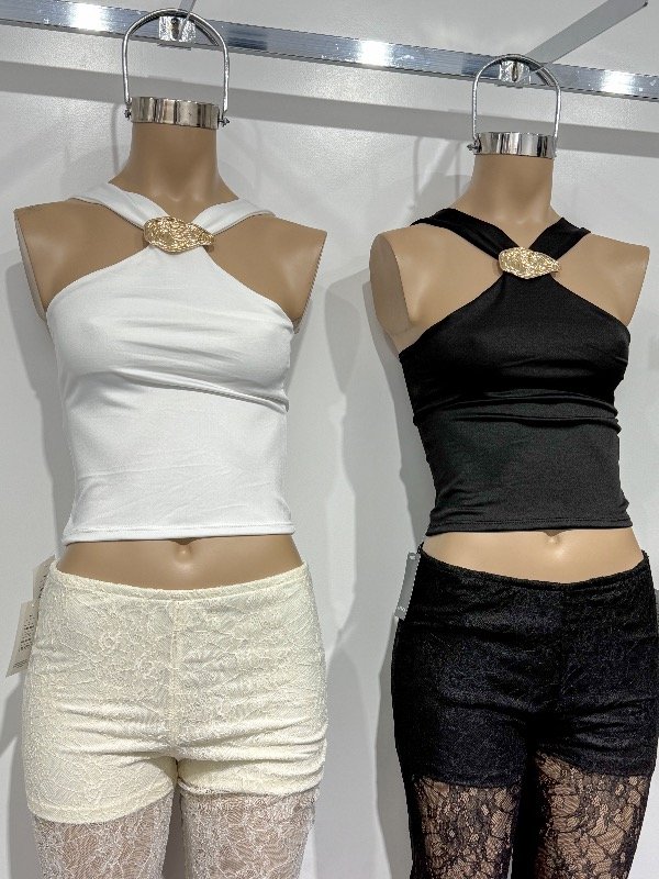 Top de microfibra con hebilla dorada irregular con textura. Talle único, abarca S/M.